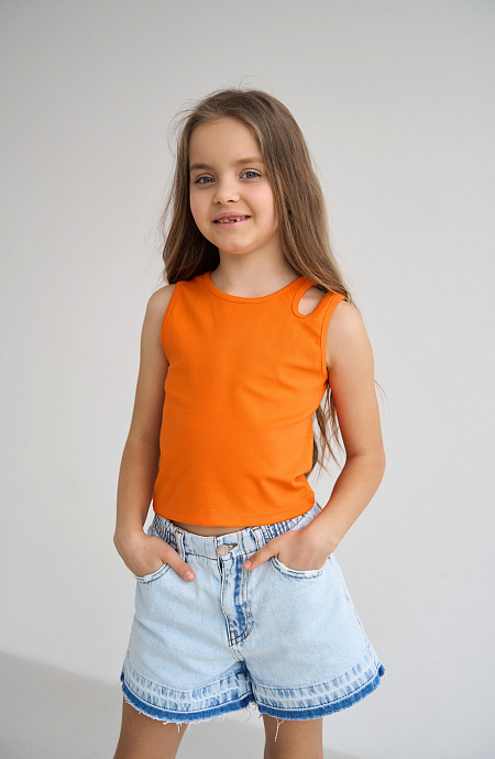 Детский топ с фигурным вырезом на плече в цвете апельсин