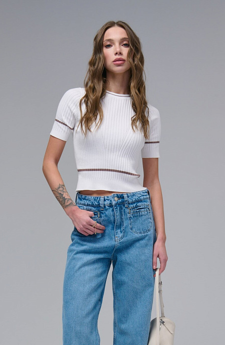 Обтягивающий верх идеально смотрится с шортами (джинсовыми или тканевыми). Девушки подчеркивают тонкую талию, а также длинные и стройные ноги. Для создания повседневного образа подходит короткая джинсовая юбка. Для завершения композиции потребуются туфли на танкетке или шпильке. При желании можно использовать кеды.
