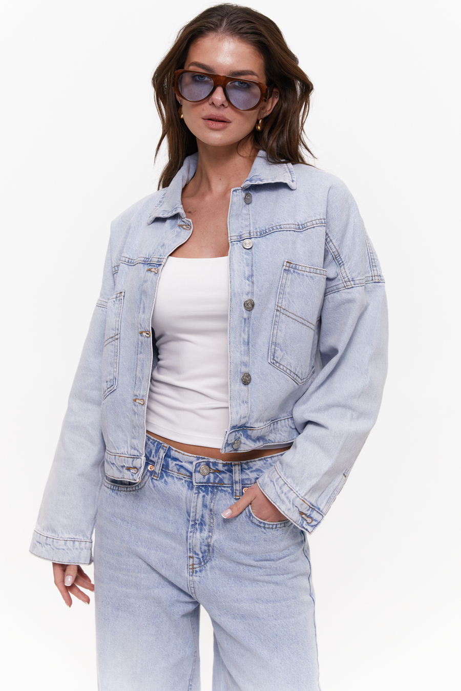 Укороченная голубая джинсовая куртка из 100% хлопкового денима — легкая, удобная и невероятно универсальная. Классический воротник, контрастные швы и выразительные карманы добавляют образу структуры, а укороченный крой позволяет подчеркнуть талию. Носи с высокими джинсами (арт. 7038), юбкой или трикотажным платьем — всегда будет выглядеть уместно. Стильная голубая джинсовка — идеальна для повседневных образов, прогулок по городу, путешествий и теплых летних вечеров.