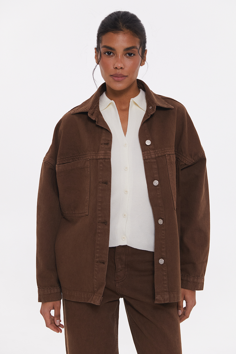 Джинсовая куртка в насыщенном шоколадном оттенке — стильная базовая вещь, легко заменяющая легкий тренч или жакет. Прямой силуэт и минималистичный дизайн позволяют совмещать ее с платьями, джинсами или мини-юбками (арт. 6421). Цвет особенно гармонично смотрится с молочным, бежевым, кремовым, карамельным, нежно-розовым, голубым и оливковым денимом. Женская джинсвока будет уместна во время прогулки, на встрече с друзьями или в путешествии – универсальный вариант на межсезонье. Носы в паре с шоколадными джинсами для завершенного образа.