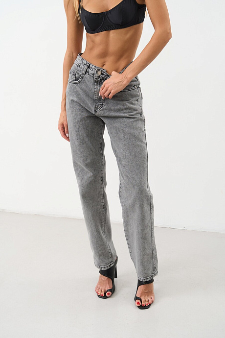 Прямые темно-серые джинсы с высокой посадкой – база для осенне-зимних аутфитов. Выполненные из плотного коттона, застегиваются на молнию и пуговицу спереди. Благодаря универсальному крою, такие джинсы легко сочетаются с одеждой любого стиля. Гармоничную компанию им может составить оверсайз-жакет, одетый сверху приталенного топа нейтрального оттенка. Чтобы уравновесить пропорции, дополни образ узким ремнем.