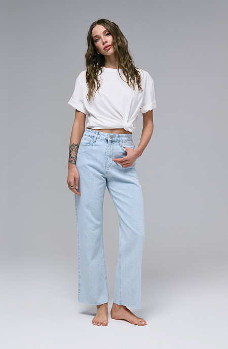 Рваные джинсы мом (mom) светло-голубого цвета. Посадка – высокая. Длина брюк зависит от вашего роста, чем ниже рост, тем брюки длиннее. Также, в зависимости