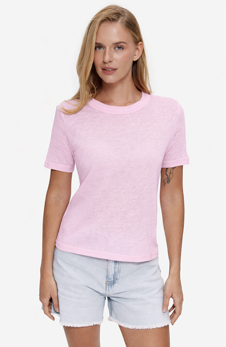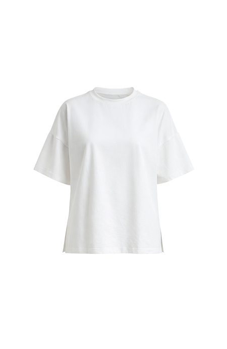 Вязанная футболка универсального белого цвета. Базовая модель выполнена из тонкого трикотажа, в составе которого только натуральные волокна, поэтому отлично подходит для весенних образов. Дополните белую футболку серыми джинсами мом или палаццо и лавандовым пиджаком из новой коллекции, добавьте обувь зеленого цвета и вы получите отличный повседневный look. Более романтическое сочетание получится с сатиновой юбкой, тренчем, ботильонами в пастельной гамме и блестящей сумкой.