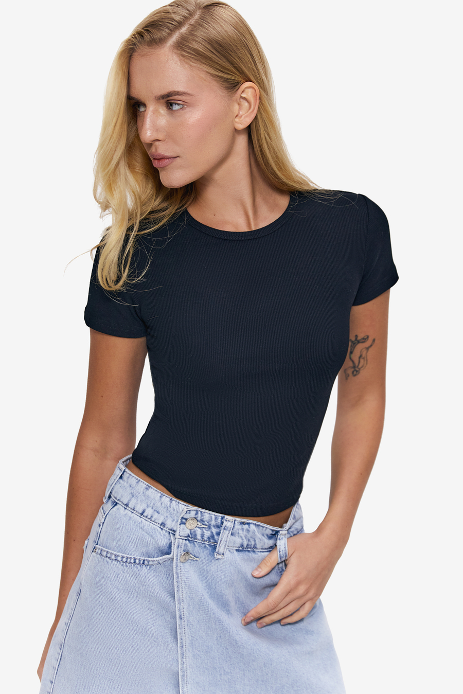 Укороченная базовая футболка черного цвета. Лаконичный дизайн и мягкий вискозный трикотаж делают эту модель очень универсальной. А базовый цвет позволяет комбинировать ее с одеждой и аксессуарами во всех палитрах. Наш фаворит этой весны – серый total denim look с джинсами мом, классической джинсовкой, черной футболкой и яркими аксессуарами.