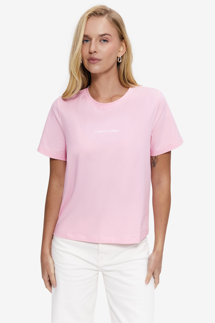 Футболка с надписью “I need coffee” — удобная модель, которая идеально подойдёт для повседневного ритма. Хлопковая ткань делает её универсальной для ежедневных выходов, а свободный крой дарит свободу движений. Минималистичная надпись добавляет образу лёгкой иронии, не перегружая его деталями.Сочетайте футболку с молочными джинсами, белыми кедами и лаконичной сумкой — для современного стрит-лука. В отпуске или на выходных носите с льняными шортами (арт. 6307), сандалиями и солнцезащитными очками, а для встречи в кофейне комбинируйте с сатиновыми брюками (арт. 6117) и структурированной сумкой.