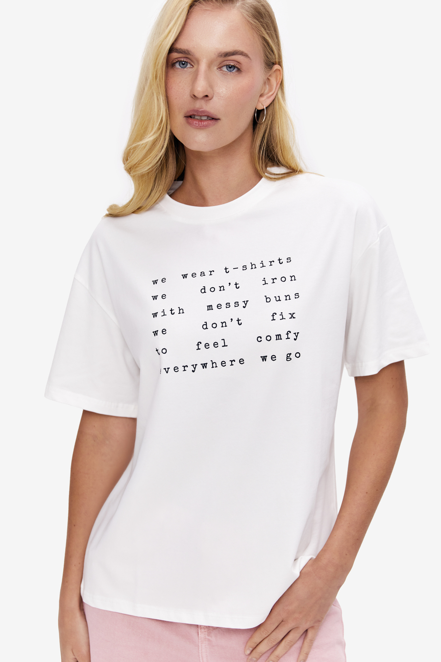 Свободная хлопковая футболка с минималистичным текстовым принтом — база, в которой чувствуешь себя уверенно и остаёшься собой в любом ритме дня.Универсальный крой позволяет легко стилизовать эту модель под настроение. Сочетайте с денимом и кедами для непринуждённых casual-образов, с леггинсами (арт. 2907) или трикотажными шортами — для расслабленных выходных луков, либо с юбкой и жакетом для лаконичных городских образов.Идеальный выбор для тех, кто ценит простоту, комфорт и внутреннюю свободу.