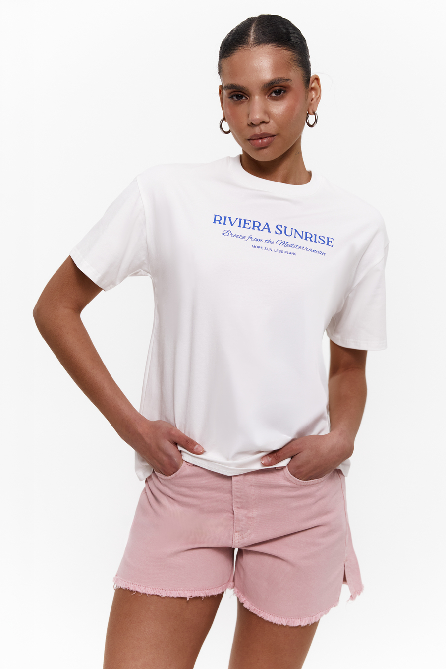 Футболка с принтом Riviera Sunrise – об ощущении лета, солнца и легкости. Приятная на ощупь хлопчатобумажная ткань дарит комфорт и свободу движений, а классический крой позволяет легко вписать эту модель в любой гардероб. Принт добавляет образ курортного настроения и ассоциируется с неспешными утренними утрам у моря. Соединяй эту футболку с прямыми джинсами или светлыми штанами wide-leg, белыми кедами или минималистичными лоферами для встреч на летней террасе. Дополни образ лаконичным браслетом и солнцезащитными очками с тонкой оправой. В отпуске комбинируй футболку с легкими шортами (арт. 6307) и юбками, а вечером с сатиновыми штанами (арт. 6117) и балетками с острым носком.