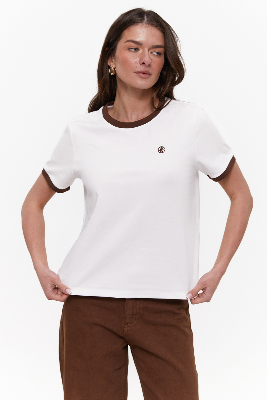 Футболка с контрастной окантовкой и лаконичным лого придает образу графичности и спортивной эстетики. Мягкая хлопковая основа обеспечивает комфорт и легкость в носке, сохраняя форму в течение дня. Соединяй ее с базовыми джинсами или штанами для городского стиля, или с шортами – для более расслабленного вида. Кеды, лоферы или минималистичные сандалии удачно дополнят образ в зависимости от настроения. Футболка подойдет для активного отдыха, путешествий и комфортных повседневных луков.