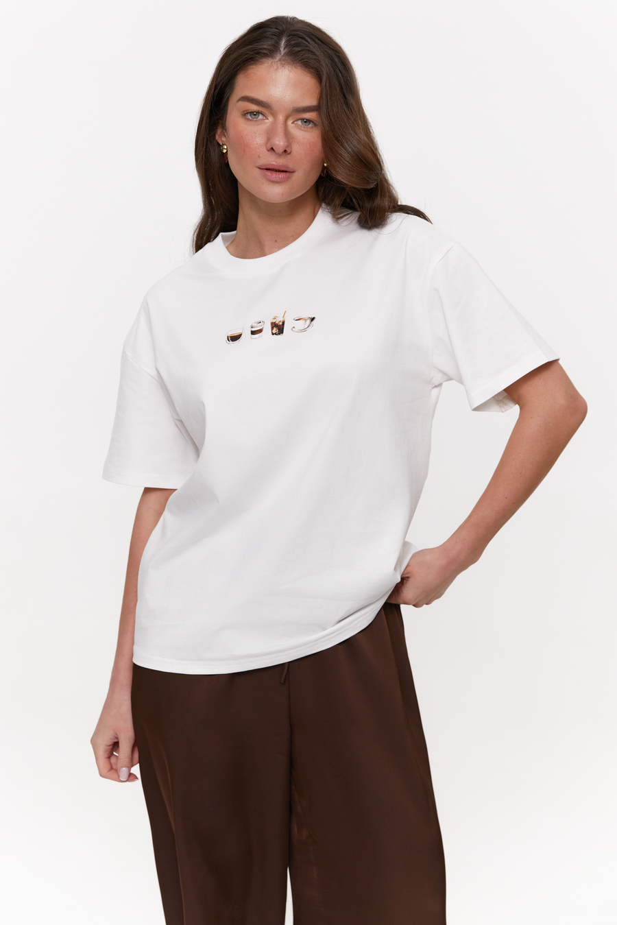Свободная хлопковая футболка с минималистичным принтом, который напоминает о любимых guilty pleasure. Для тех, кто ценит маленькие радости без чувства вины и моменты, которыми хочется наслаждаться медленно. Мягкая натуральная ткань приятна к телу, хорошо дышит и обеспечивает комфорт в течение дня. Универсальный крой позволяет легко стилизовать модель под любое настроение. Сочетайте с денимом или лёгкими брюками (арт. 6117) для игривых casual-образов, с шортами — для отпуска или с юбками и сандалиями для уютных встреч за чашкой кофе.Идеальный выбор для дней, когда хочется порадовать себя чем-то приятным.