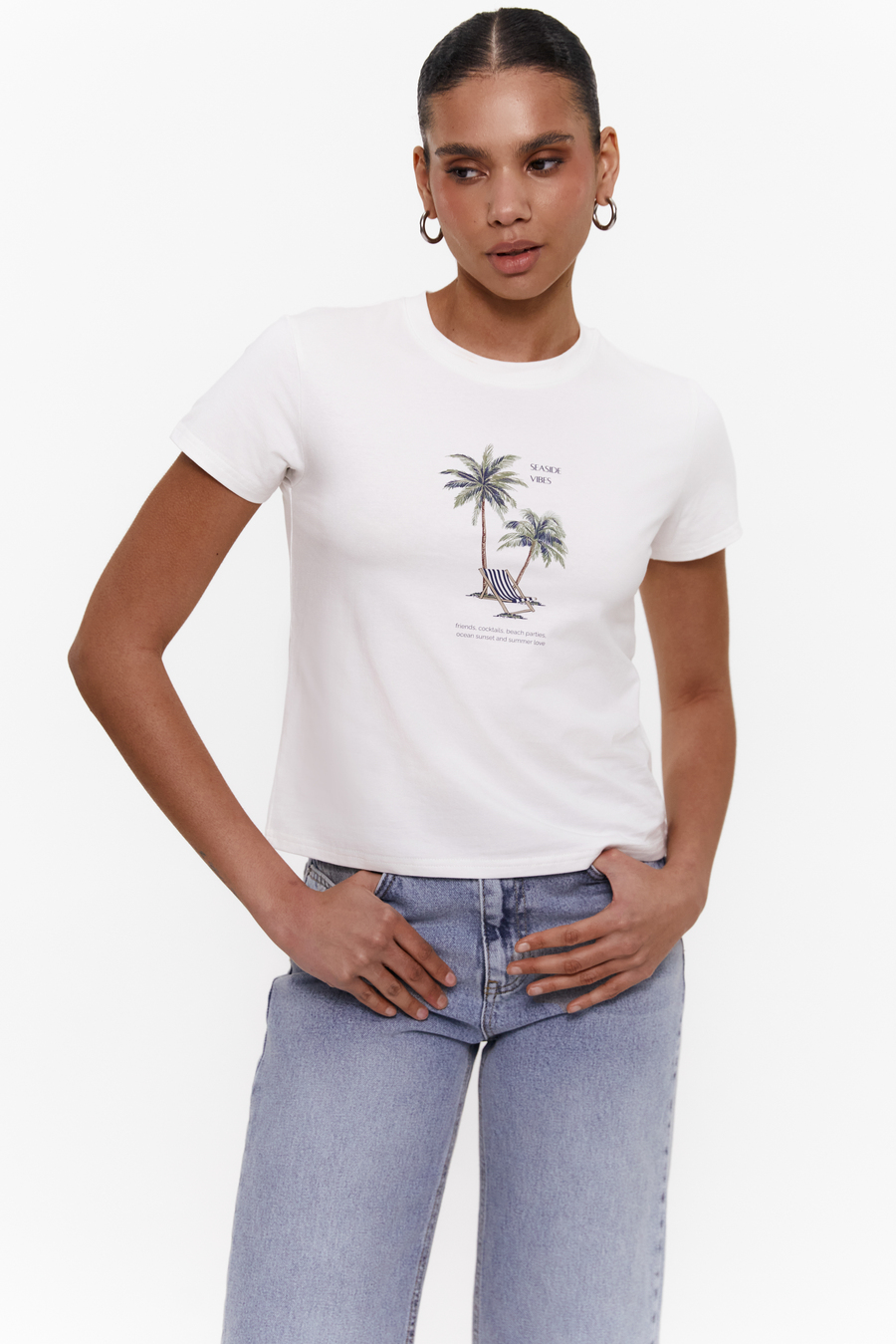 Белая хлопковая футболка с изображением пальм – база для твоего отпуска и летних будней. Для тех, кто мечтает о теплом песке под ногами, соленый ветер в волосах и неспешные утренники. Натуральная ткань и свободный крой обеспечивают свободу движений и комфортные ощущения в течение дня. Сочетай с любимым денимом, льняными штанами или шортами (арт. 6307) для легких летних аутфитов. Настоящая находка для курортного отдыха, приятных прогулок и дней, когда хочется добавить в образ немного безмятежности.