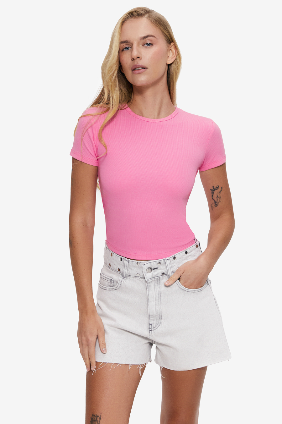 Базовая футболка прилегающего кроя розовом цвете. Лаконичный дизайн и мягкий вискозный трикотаж делают эту модель очень универсальной. Комбинируй голубую футболку с одеждой в молочной, песочной, лавандовой, лимонной или розовой палитре. Наш фаворит этого сезона – трендовый образ с белыми джинсами мом и желтыми аксессуарами.