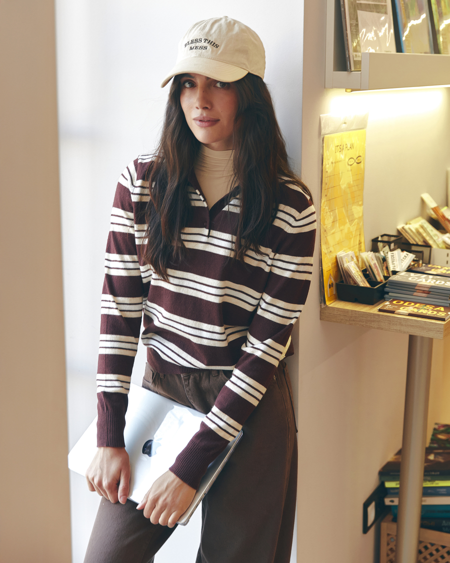 Джемпер в полоску – теплый, уютный и очень актуален в осенне-зимнем сезоне. Горловина-поло добавляет спортивную нотку, а контрастные полосы — настроение ретро. Идеально сочетается с темным денимом, свободными брюками или длинной юбкой. Этот вариант – мастхев для учебы, офисных будней, неформальных встреч и легких образов в стиле smart casual.