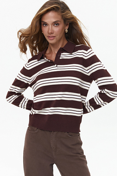 Джемпер с воротником поло из тонкого хлопкового трикотажа в широкий рубчик. Имеет приталенный фасон, благодаря чему образ выглядит более спортивным и подтянутым. В теплую погоду сочетай его с мини-юбкой плисе для создания актуального образа в теннисной эстетике. В то же время такой джемпер прекрасно дополнит образ в классическом стиле, если скомбинировать его с деловыми брюками палаццо. Еще одним удачным союзником для этой модели могут стать мешковатые джинсы baggy.