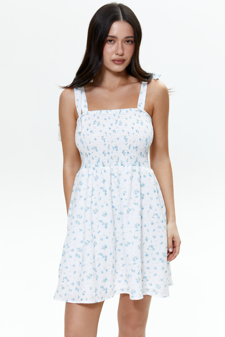 Легкое платье из 100% хлопка с нежным цветочным принтом создает романтическое и свежее настроение. Завязки на плечах придают образу деликатности и позволяют регулировать посадку. Приталенный верх и свободная юбка красиво балансируют силуэт, делая его женственным и легким. Носы с сандалями, эспадрильями или балетками для прогулок, путешествий или летних встреч. Идеальное хлопковое платье для теплых дней, когда хочется выглядеть нежно без лишних усилий.