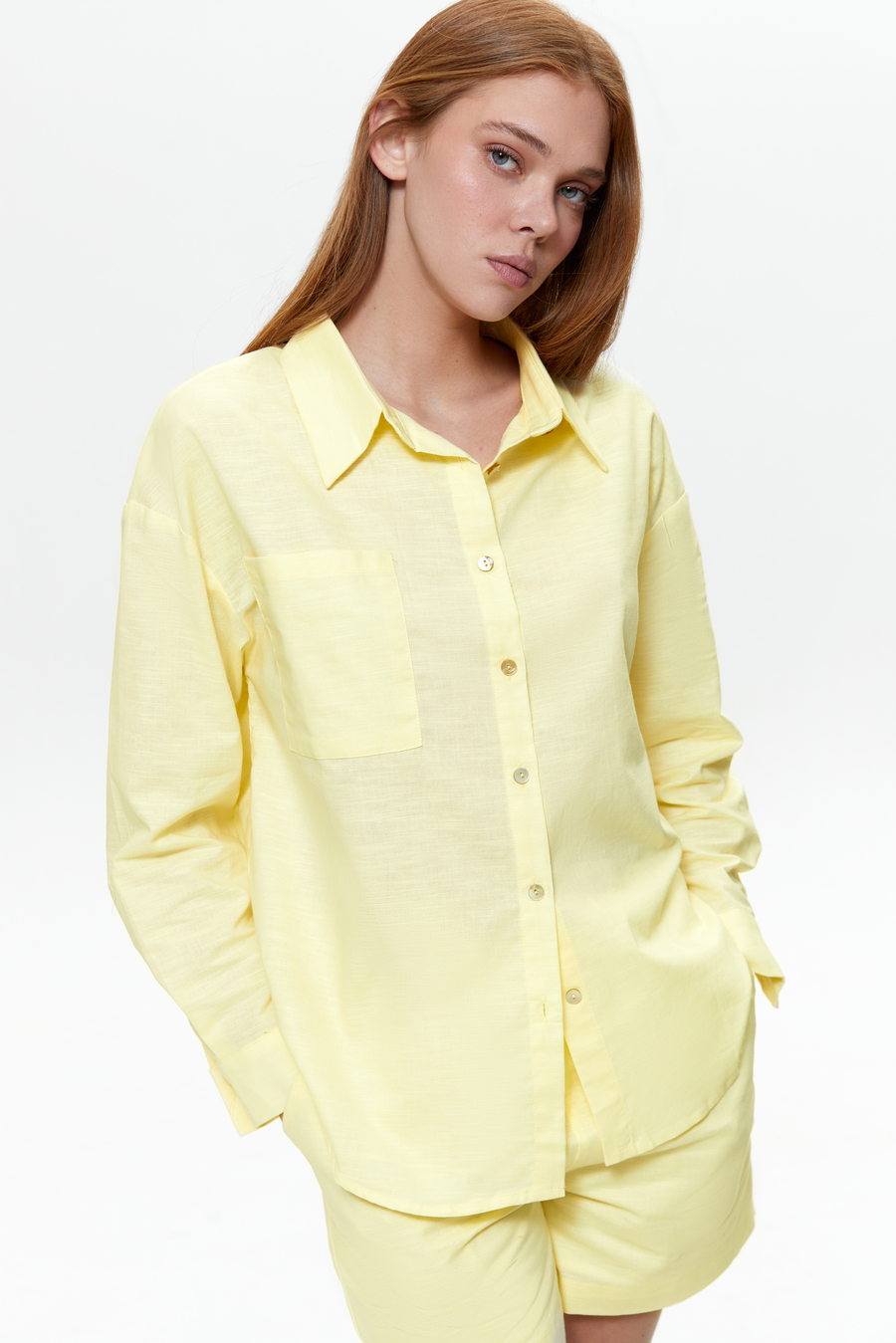 Рубашка из натурального материала на основе хлопка и льна создана для комфорта в теплое время года. Лен придает легкость и природную текстуру, а хлопок — мягкость и удобство в уходе. Прекрасно сочетается с легкими брюками (арт. 6118), льняными шортами (арт. 6307), джинсами или юбками. Женская льняная рубашка – удачный выбор для весенних прогулок, отпуска, летних рабочих будней или неформальных встреч. Выглядит непринужденно, но в то же время стильно и аккуратно.