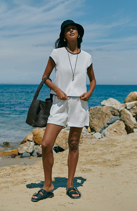 Комплект в полоску из шорт и рубашки с контрастным воротничком и манжетами — идеальный микс официального стиля и летней легкости. Рубашка придает элегантности, а шорты с эластичным поясом-резинкой и двумя пуговицами делают образ более расслабленным. Рубашку можно носить как второй пласт поверх белого базового топа или застегивать полностью для более опрятного вида. Кроме того, каждый элемент комплекта легко стилизуется отдельно — у тебя будет еще больше вариантов для ярких весенне-летних аутфитов.