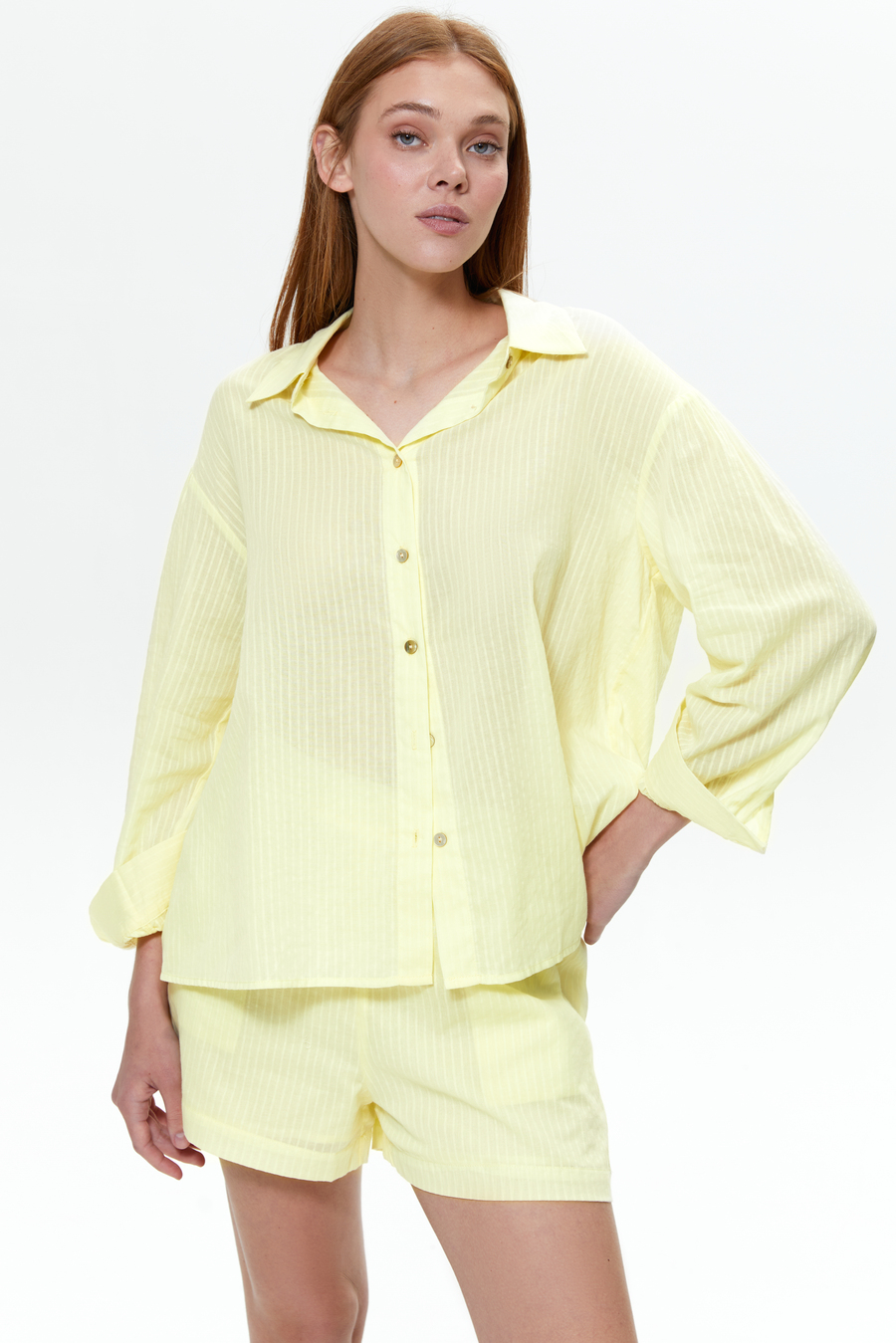 Комплект-двойка, выполненный из 100% хлопка, станет идеальной базой в теплое время года. Рубашка с длинным рукавом обеспечит защиту от солнечных лучей, а удобные шорты на резинке гарантируют полную свободу движений. Едва заметный принт в полоску придает образу простой элегантности. Шорты и рубашка идеально дополняют друг друга, формируя цельный лук, но ты смело можешь стилизовать каждый элемент в отдельности, комбинируя с другими предметами своего гардероба.