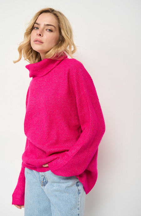 Поло черного цвета в белую полоску – must have сезона. Приятный к телу натуральный материал достаточно плотный и хорошо держит форму. Базовый крой позволяет по-разному стилизовать свитер, например, с серыми джинсами мом, кожаными палаццо или черной мини-юбкой из трикотажа в рубчик. Универсальный цвет подходит ко всем возможным палитрам. Рекомендуем создать с этим свитером монохромный образ с ярким акцентом, дополнив его черными лосинами, казаками белого цвета и сумкой-багетом в трендовом оттенке Viva Magenta.