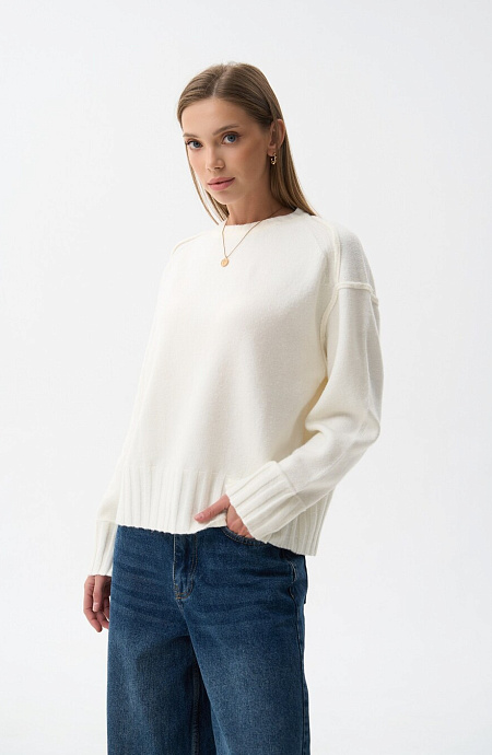 Уютный свитер с V-образным вырезом и красивой фактурой вязки. Он имеет слегка свободный силуэт, который подчеркивает фигуру без сильного прилегания, а универсальный белый цвет подойдет к любой палитре. Сочетайте джемпер с джинсами мом и палаццо в повседневных образах и сатиновой юбкой миди в праздничных.