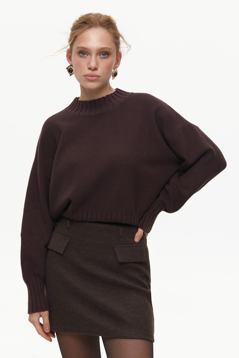 Укороченный свитер с выразительными широкими манжетами, которые добавляют силуэту фактурности и стильный акцент. Отлично сочетается с джинсами с высокой посадкой и кроссовками или ботинками на массивной подошве для повседневного выхода. Для более эффектного образа попробуй сочетать его с мини-юбкой и высокими сапогами или широкими костюмными брюками. Благодаря лаконичному крою он легко вписывается и в кэжуал, и в более изысканные комбинации.