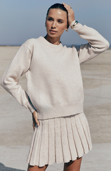 Уютный вязаный свитер свободного силуэта в цвете года по версии Pantone. Благодаря лаконичному дизайну он идеально комбинируется с разными джинсами, классическими и кожаными брюками, юбками. Особенно эффектно выглядят образы с контрастными фактурами, например, сочетание меланжевого свитера и нежного сатинового платья или юбки в длине миди. К оригинальному фиолетовому оттенку very peri подходит спокойная палитра: белый, молочный, лавандовый, мятный, нежно-розовый, холодный беж, серый, черный). Выбор стилистов SOLMAR – яркий аутфит с меланжевым свитером, белым сатиновым платьем и серебристыми лодочками.