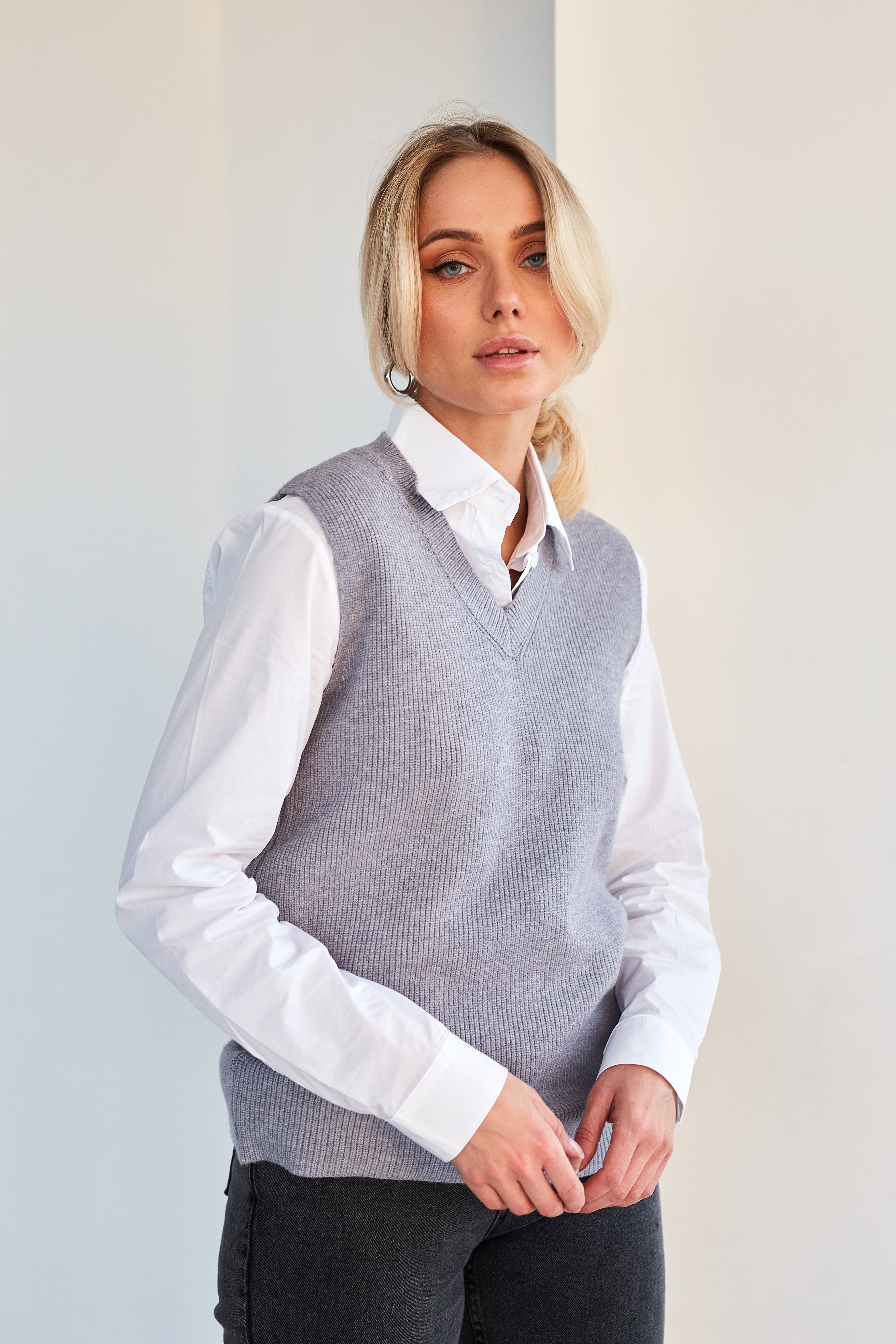 Серая вязаная жилетка – стильный элемент базового гардероба. V-образный вырез горловины, гармоничная длина и гладкая фактура обеспечивают большую вариативность образов с трикотажной жилеткой. В качестве первого слоя можно выбрать oversize рубашку, джемпер с воротником поло или гольф в рубчик. Нейтральный серый идеально сочетается с белым и черным, а также с насыщенными трендовыми оттенками (электрик, зеленый, фуксия). Выбор стилистов SOLMAR – расслабленный образ с серой жилеткой, белым джемпером свободного кроя, графитовыми джинсами палаццо и черными кроссовками.