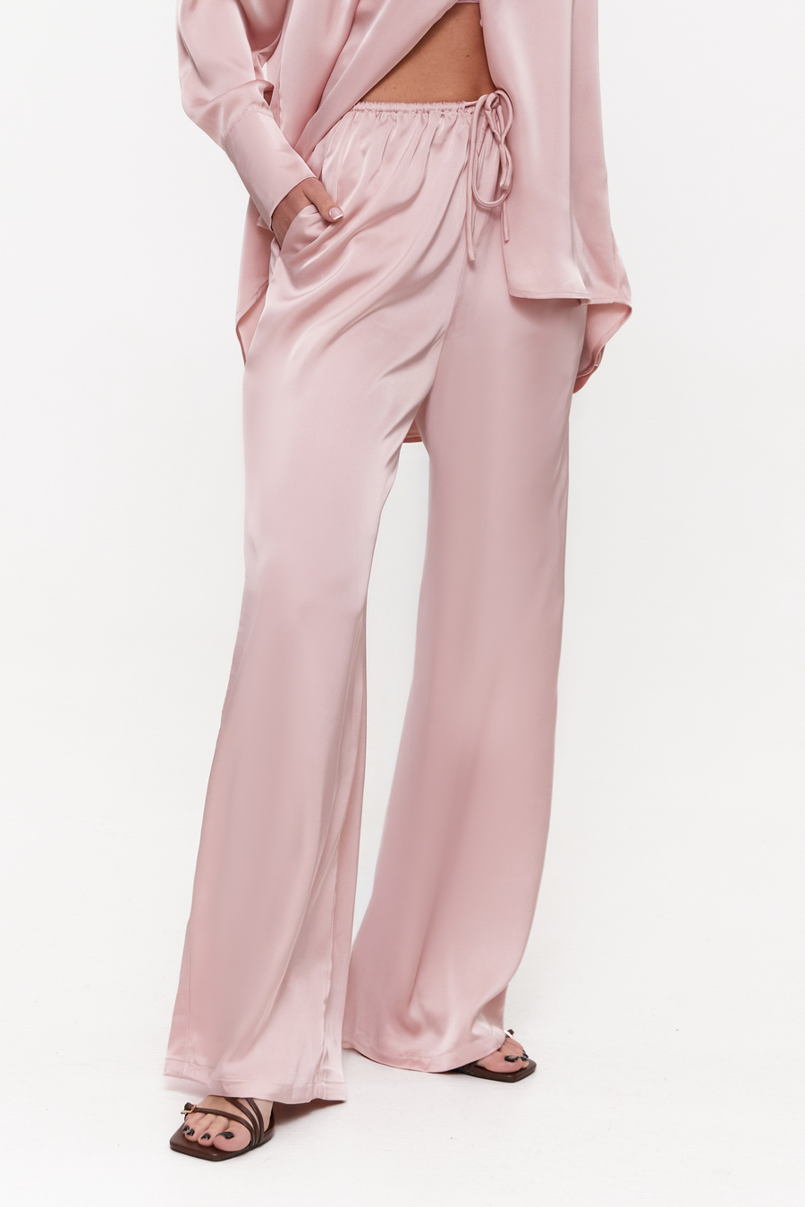 Сатинові штани з легким блиском додають образу витонченості без зайвої урочистості. Тканина особливо красиво виглядає під час ходи, створюючи відчуття легкості та розслабленої елегантності. Жіночі штани з сатину однаково доречні як для вечірніх виходів чи побачень, так і для стильних буднів. Легко поєднуються з жакетами, майками чи базовими футболками. Доповни штани сатиновою сорочкою в тон (арт. 6519), як базу додай приталений лонгслів або боді (арт. 3116) — і вийде завершений, помірно вишуканий образ.