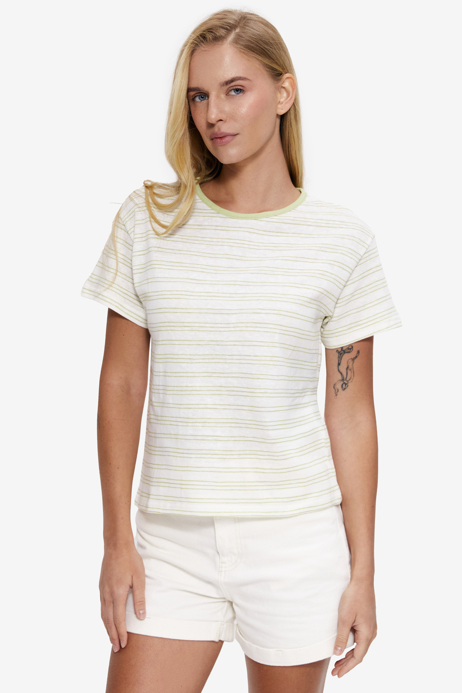 Зручна смугаста футболка на основі бавовни добре тримає форму та залишається комфортною протягом усього дня. Тонка смужка додає образу легкості та нотку безтурботності. Ідеально комбінується з денімом, літніми шортами та спідницями, а також гармонійно поєднується з класичними штанами. Жіноча футболка у тонку смужку — база для зручних і невимушених casual-луків. Підійде для весняно-літніх прогулянок, зустрічей із друзями або подорожей. Практична модель, яка освіжає щоденні образи без зайвих зусиль.