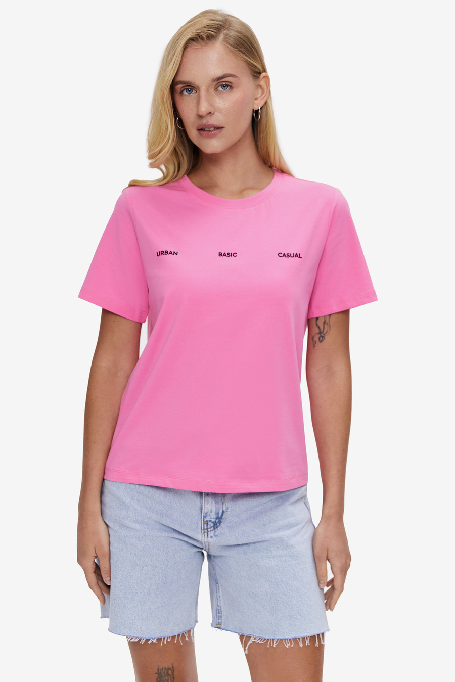 Футболка класичного фасону з акуратним силуетом — база, що завжди доречна. Прямий крій красиво лягає по фігурі, а стандартна довжина робить модель універсальною для різних стилізацій. Лаконічний ненав'язливий напис додає настрою та легко зчитується як стильний акцент. М’яка бавовняна тканина (95%) забезпечує комфорт і легкість протягом дня. Зручна і практична жіноча футболка для повсякденних луків, прогулянок містом або дружніх зустрічей. Гармонійно лягає в образ як основа під сорочку, джинсовку чи кардиган.