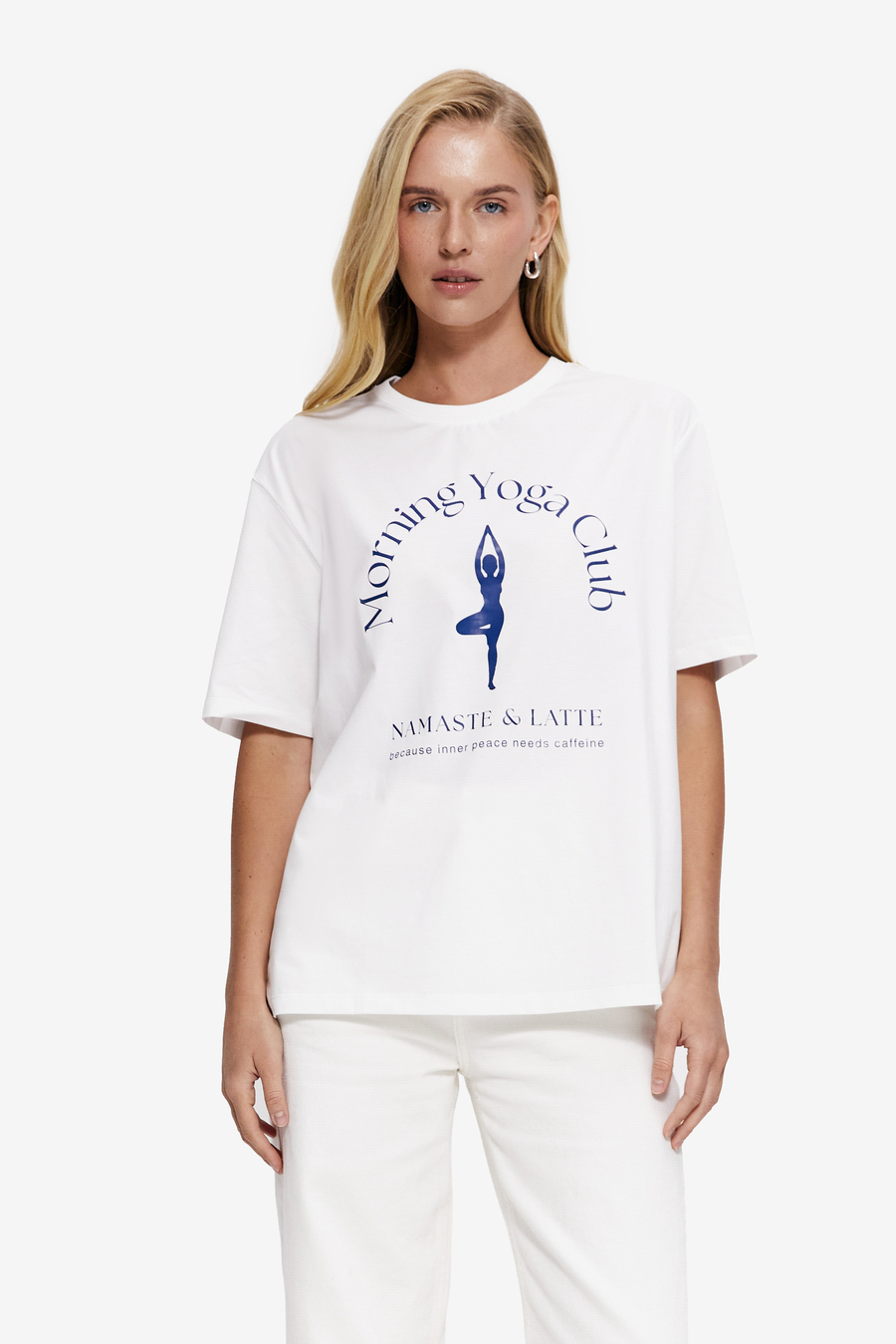 Футболка вільного крою з ілюстративним принтом — база з настроєм slow living. Для тих, хто підтримує ідеї ментального здоров’я та дозволяє собі маленькі щоденні радощі. М’яка бавовняна тканина комфортно лягає по фігурі та дарує відчуття затишку протягом дня. Біла футболка з принтом легко поєднується з денімом, трикотажними шортами, легінсами (арт. 2907) або спідницями в стилі tennis core. Пасує як для неспішних медитативних ранків, так і для активного відпочинку на вихідних. Ідеальна база для твоїх sport casual образів.