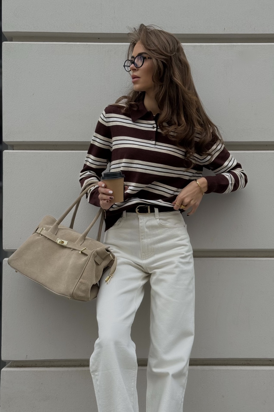 Джемпер у смужку - теплий, затишний і дуже актуальний в осінньо-зимовому сезоні. Горловина-поло додає спортивної нотки, а контрастні смуги - настрою ретро. Ідеально поєднується з темним денімом, вільними штанами або довгою спідницею. Цей варіант — мастхев для навчання, офісних буднів, неформальних зустрічей і легких образів у стилі smart casual.