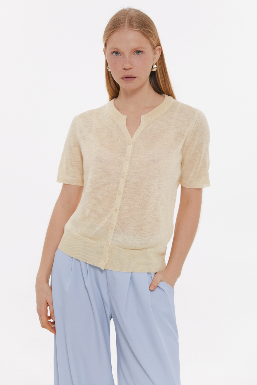 Легкий жіночний джемпер на ґудзиках, що виглядає свіжо та сучасно. Високий вміст віскози забезпечує м’якість, повітропроникність і комфорт у теплу пору року. Завдяки мінімалістичному дизайну та делікатній текстурі ця модель легко стане базою гардероба. Джемпер можна носити застібнутим як самостійний верх або розстібнутим поверх сукні чи майки. Комбінуй зі штанами пастельних відтінків (арт. 6118) для цілісного образу. Ідеальний вибір для офісу, кави з подругами або прогулянок весняним парком.