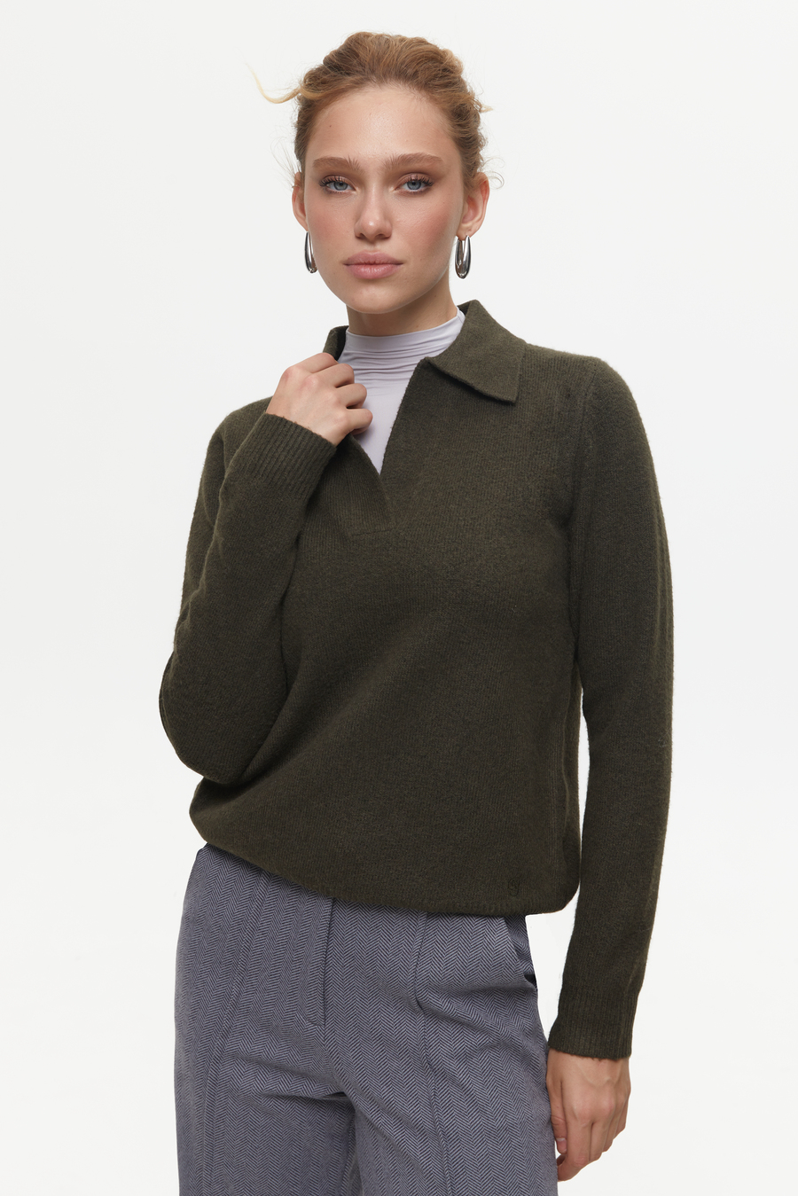 Светр з коміром поло дарує додаткове тепло за рахунок наявності вовни у складі. Дозволить швидко зігрітися у прохолодні осінньо-зимові дні та при цьому почуватися стильно. Комір поло робить образ більш відкритим, додає нотки аристократичності та трохи спортивного настрою цій моделі. Светр ідеально комбінується зі спідницею плісе (арт. 6407), утворюючи затишний лук у стилі smart casual з відтінком old money