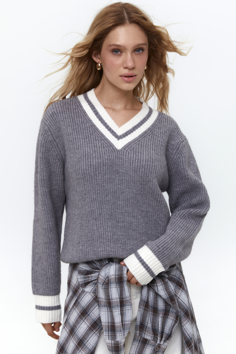 Светр із глибоким V-вирізом і контрастним кантом, натхненний коледжним стилем, але з сучасним вайбом. Ідеально поєднується з білою сорочкою, створюючи охайни лук у стилі smart casual. Спробуй носити його з плісированою спідницею міді та лоферами для preppy-естетики або з мішкуватими джинсами та кросівками для ефектного контрасту. Додай бейсболку чи тренч - і вийде трендовий стрітстайл-образ.
