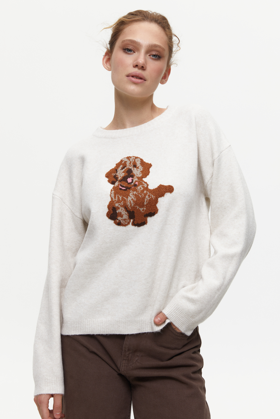 Молочний светр із пухнастою аплікацією у вигляді песика — це втілення грайливості та максимального затишку. Ідеальний варіант, якщо хочеться додати настрою та легкості у холодний сезон. М’який на дотик, зручний у носінні — це справжній в’язаний антистрес. Чудово поєднується з прямими чи широкими джинсами, трикотажними штанами та базовими спідницями. Одягай на каву з подругою, зимову прогулянку, в кіно або на домашню зустріч з друзями.