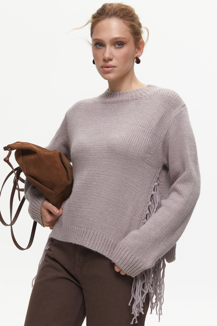 Светр вільного крою з бахромою по низу - вибір для тих, хто любить комфорт і бохо-естетику. Лаконічний силует дозволяє поєднувати його і з базовими джинсами, і з широкими штанами, а бахрома додає легкості рухам. Виглядає стильно як у кежуал-комбінаціях, так і в більш креативних вечірніх аутфітах. Спробуй поєднати його зі шкіряною мініспідницею та чоботами на невисоких підборах або з елегантними штанами та масивними прикрасами - і образ одразу зазвучить по-новому.