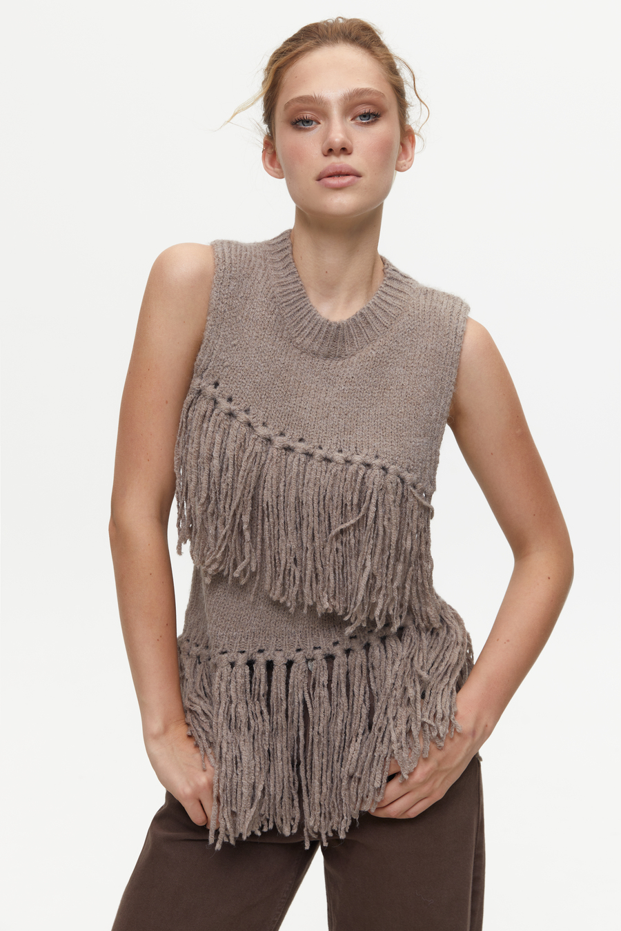 Жилет із довгою бахромою, який миттєво додає образу динаміки та богемного шарму. Його можна носити поверх сорочки з об’ємними рукавами, поєднувати з широкими джинсами або спідницею-плісе для бохо-естетики. У міжсезоння виглядає круто з тонкою водолазкою під низ і черевиками на грубій підошві або ковбойками. Це ідеальний спосіб оживити базовий гардероб однією ефектною деталлю, яка до того ж зігріватиме в прохолодну погоду.