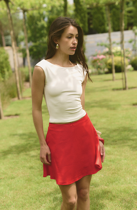 В’язана міні-спідниця з розрізом – трендова новинка для базового гардеробу. В універсальності вона не поступається класичній спідниці-олівець, а виглядає більш сучасно. Завдяки достатньо тонкому, але щільному трикотажу та модному лимонному кольору спідниця чудово доповнює весняні образи з різноманітними кофтинками, піджаками та джинсовими куртками. Стилісти Solmar рекомендують створити актуальний look з фактурним блакитним кардиганом та білим взуттям.